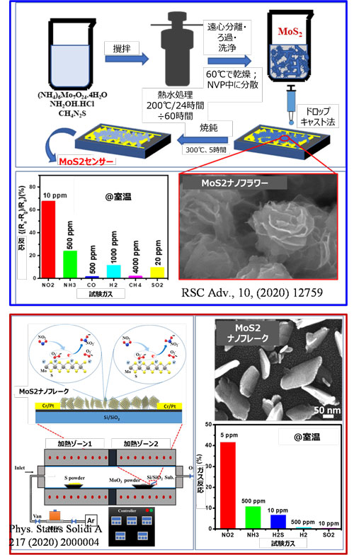 水熱法(上)およびCVD(化学気相成長)法(下)により成長させたMoS2ナノフラワーおよびナノフレークを基盤とする代表的な室温NO2センサーチップ。