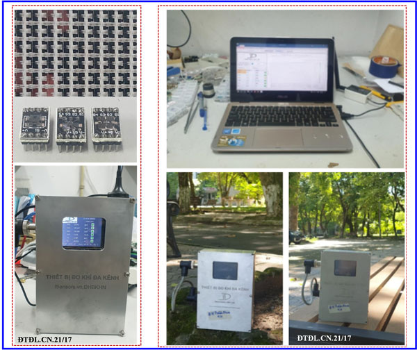 ウェハー上に製造されたセンサーチップとプリント基板に実装後(左上)。無線監視用の代表的な複数ガス監視ステーションと携帯型ガス検知器(左下)。複数ガス監視ステーションのLoRa方式信号伝送・収集のテスト(右)
