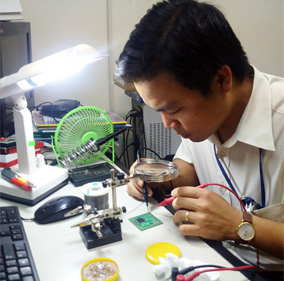 ラボでの研究開発の様子:設計・製造後のチップのテスト(2014年)