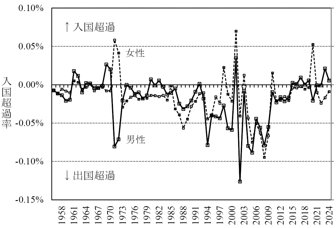 図1は1956年以降の日本人男女の入国超過率の推移を示したものである。これは,入国者から出国者を引いた値を男女別人口で割ったものであり,プラスであれば日本への入国者が出国者を上回る入国超過,マイナスであればその逆,つまり出国超過であることを意味する。