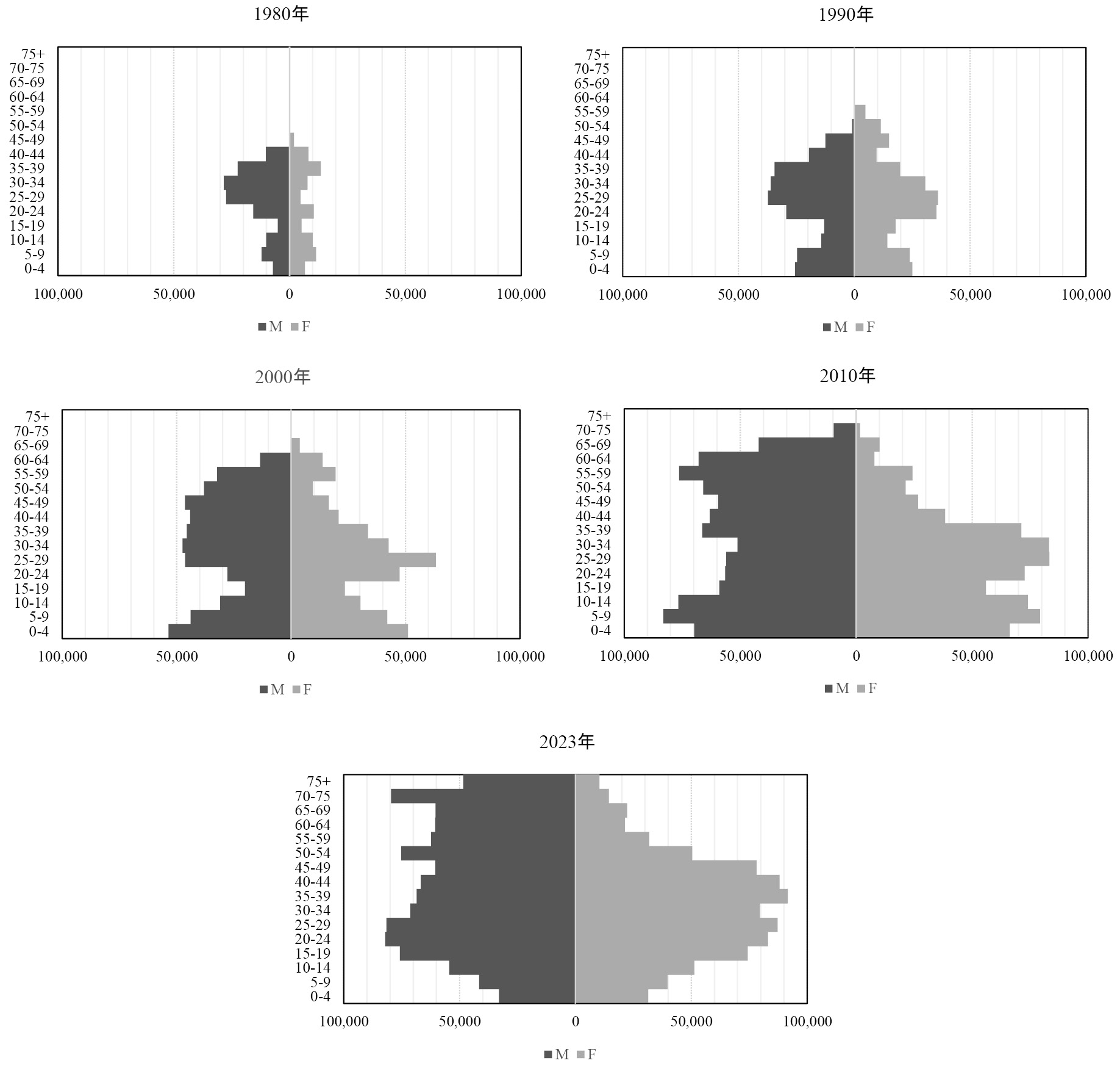 こうした傾向は1990年,2000年,2010年と顕著になっていくが,2020年になると10歳以下の子どもの人口が減少し,代わって成人,特に中高年齢の人口が増加していく。これは先述したように,海外駐在員の減少とそれに代わる移住目的の個人化,多様化が影響していると思われる。