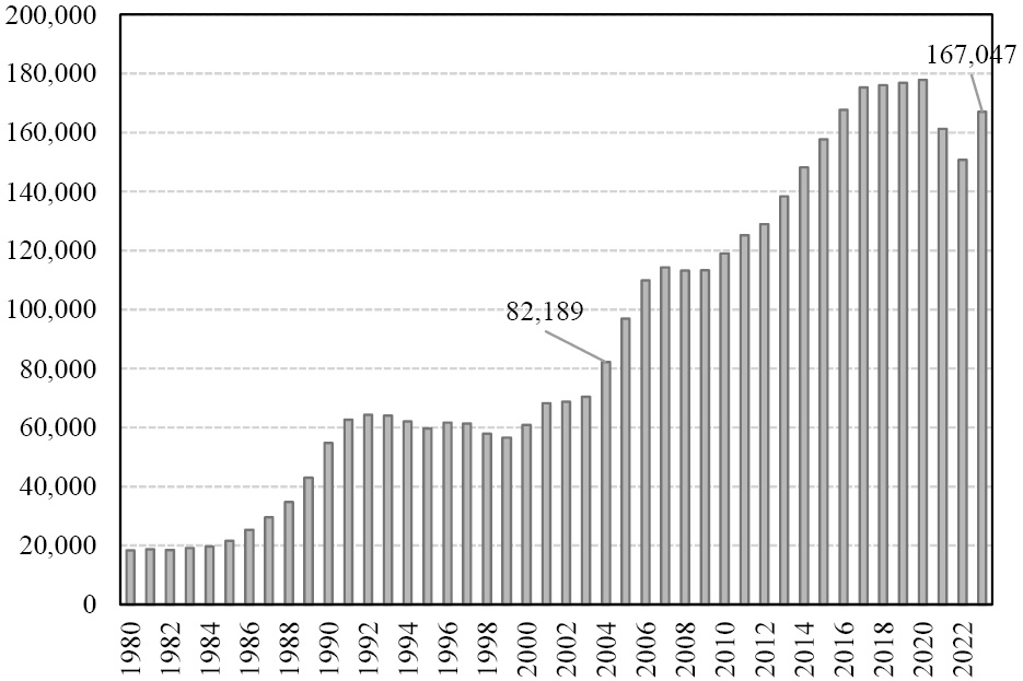 したがって,本論考では,網羅性の高い毎年の出入国統計をもとに,より正確な在外邦人数の推定を試みた。その結果,海外在住日本人人口は2023年時点で約188万人と「海外在留邦人数調査統計」よりも45%多い結果となった。また,傾向としても「海外在留邦人数調査統計」で記録されているような減少傾向は見られず,一貫して増加している。