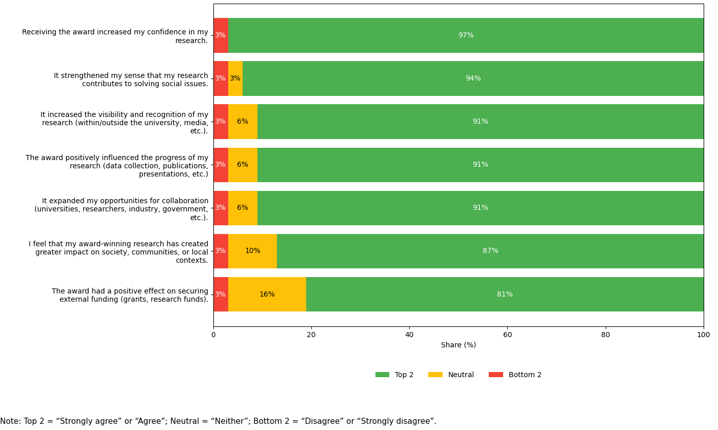 Top‑2 responses (“Strongly agree” + “Agree”) on a 5‑point scale ranged from 80–97%, indicating that receiving the Award significantly contributed to motivation and to strengthening research foundations.