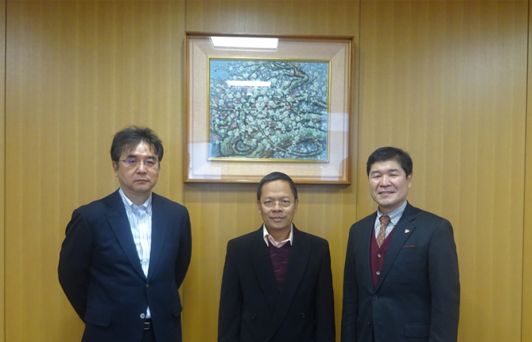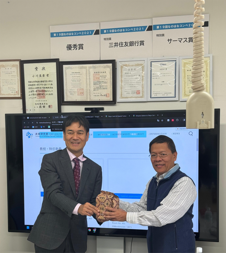Visiting the laboratory of Prof. Masahiro Takei, Vice President for Research and Academic-Industrial Collaboration, Chiba University, to discuss academic collaboration covering research and student and staff exchange, in December 2023.